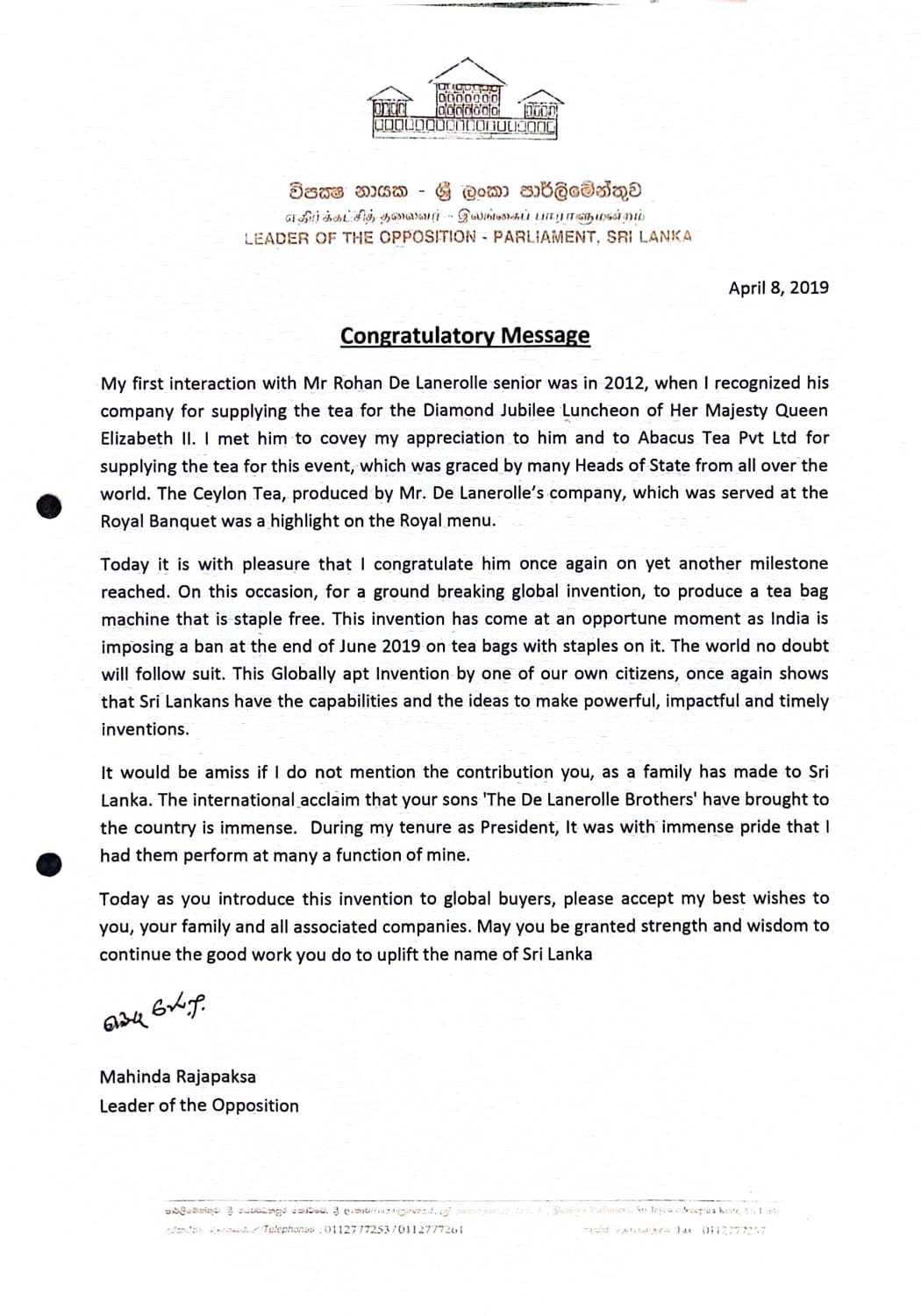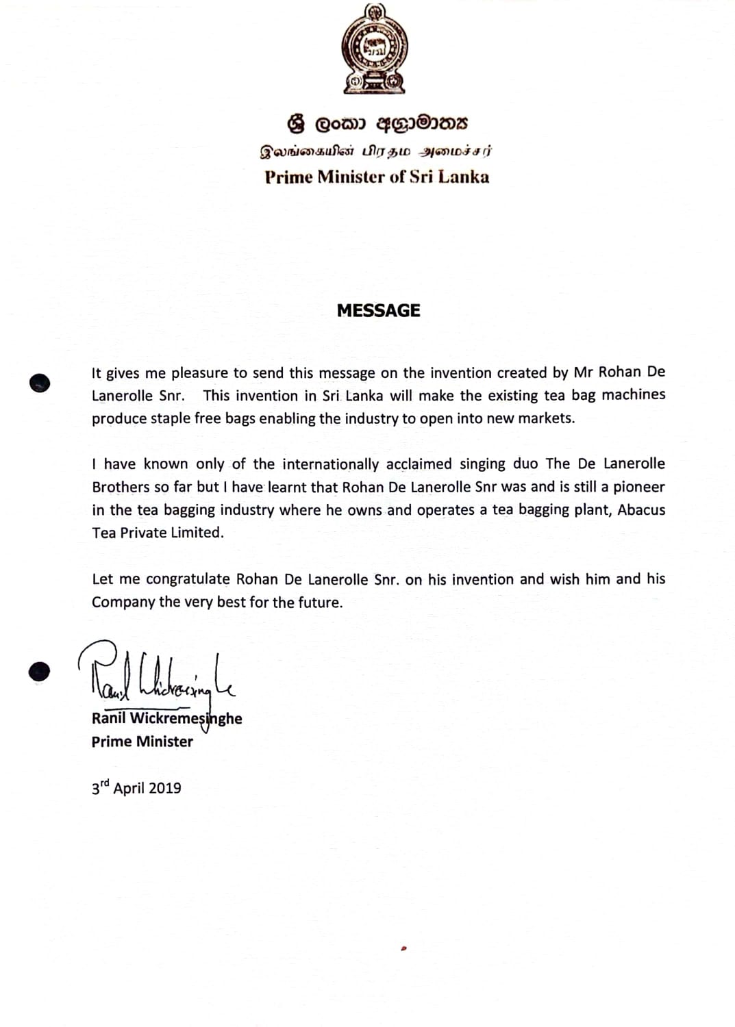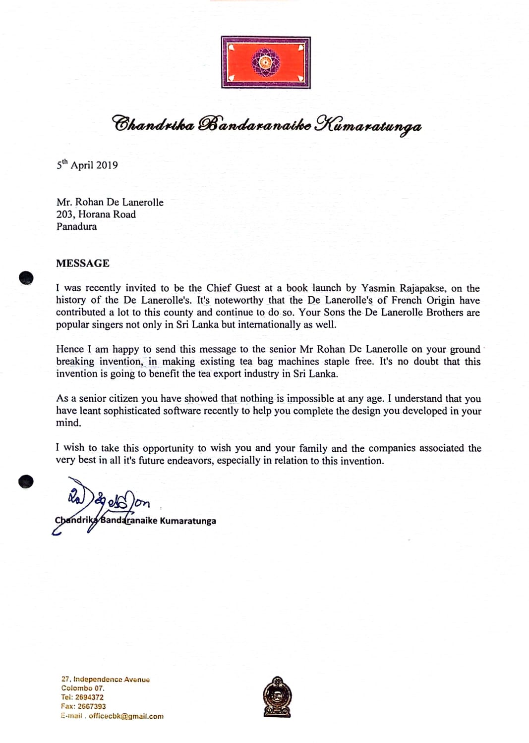 Locally, George Stuarts Ltd and Akbar Brothers Ltd, a significant tea exporter, have endorsed the technology, emphasizing its relevance and effectiveness. Rohan De Lanerolle, a sought-after Mechanical Engineer, consulted with tea bag companies globally for years. It took him three years and over 542 unsuccessful attempts before discovering a viable solution at the age of 73.