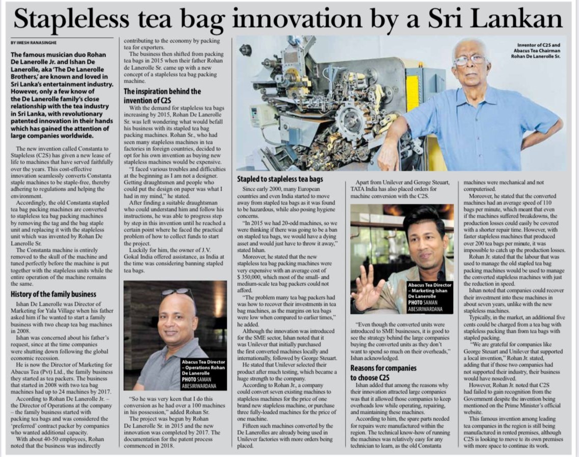 Rohan De Lanerolle's C2S.LK - Convert to Staple Less has transformed the tea industry by converting older tea bag machines into staple-free versions, providing a cost-effective alternative to purchasing new machines exceeding $1 million. Recognized by the Patent Cooperation Treaty in October 2018, this global innovation addresses challenges faced by engineers since 2000.